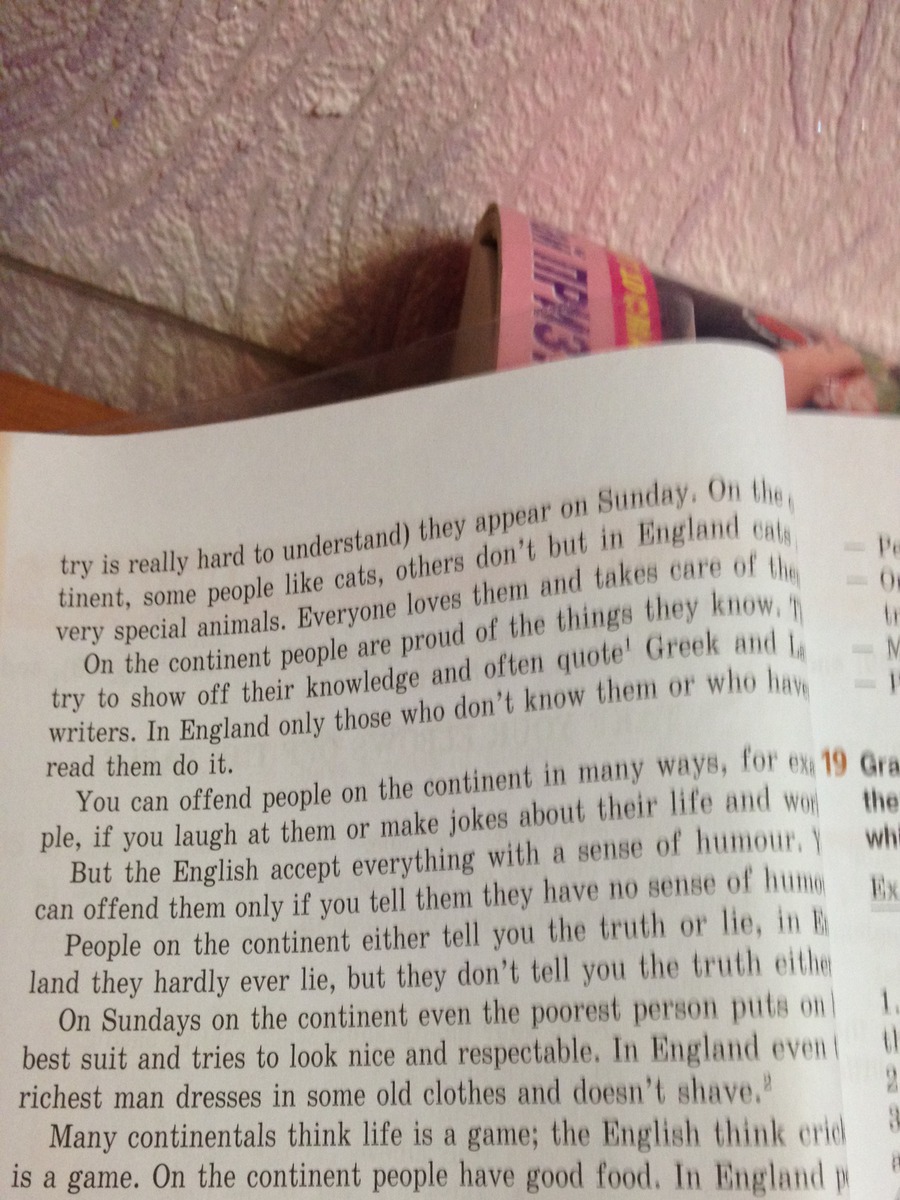 People on the continent either tell you the truth or lie, in England they hardly ever lie, but they don't tell you the truth either. On Sundays on the continent even the poorest person puts on his best suit and tries to look nice and respectable. In England even the richest man dresses in some old clothes and doesn't shave.1 Many continentals think life is a game; the English think cricket is a game. On the continent people have good food