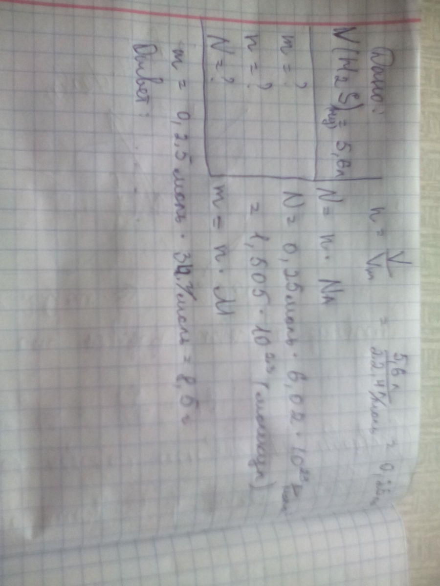 Рассчитайте массу (m), число молекул (N) и количество вещества (n) сероводорода H2S объемом 5,6 литров. (н.у.)