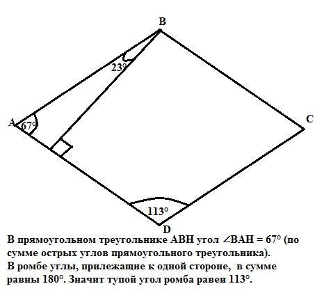 В ромбе углы, прилежащие к одной стороне, в сумме равны 180°. Значит тупой угол ромба равен 113°.