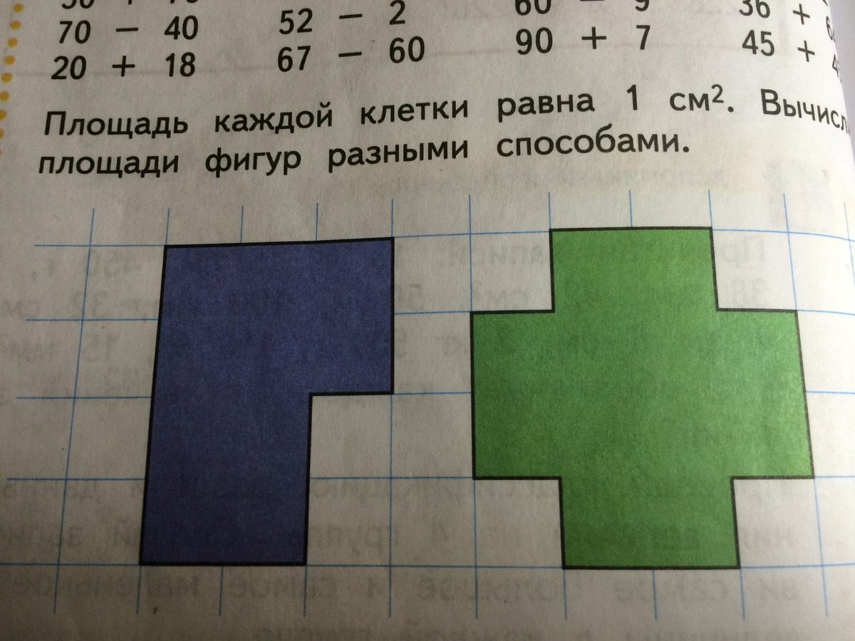 3й класс математика площадь клетки равна 1 см в квадрате. Вычисли площадь фигур разными способами?