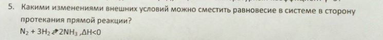 2) Температура, поскольку тебе в задачи сказано что дельта H < 0, значит что данная реакция выделяет тепло при прямой реакции, опять же принцип Le Chаtelier говорит нам что если температура будет снижена то равновесие сместится к продуктом ( на право ). Хотел еще добавить что так мы снижаем температуру то чтобы система быстрее дошла до равновесия мы должны добавить катализатор в данном случае, роль катализатора будет играть Железо.