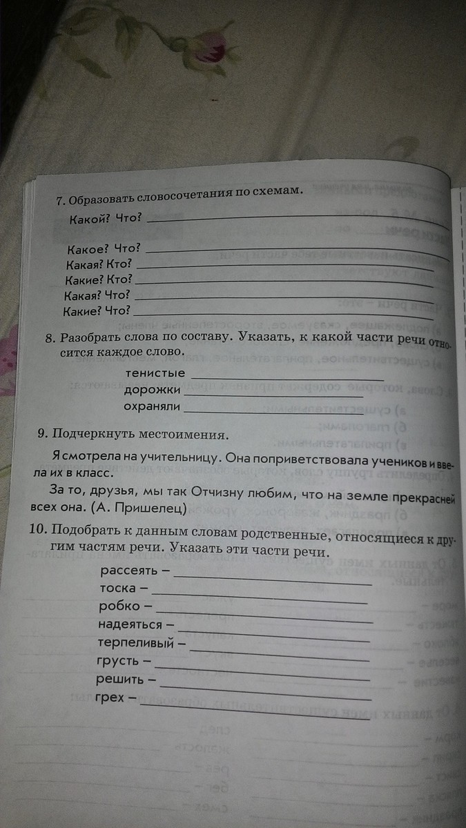 8. тенистые - прилагат, корень -тен, суф. -ист, окончание -ые