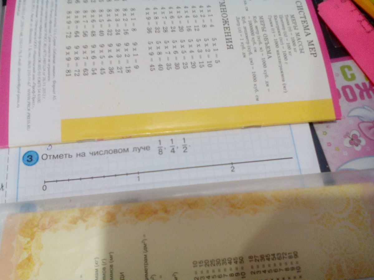 смотри, если надо отметить 1/8, тогда ищешь восьмую черточку на числовом луче. Так же с 1/4, а 1/2= половине, значит отмечаешь четвёртую чёрточку. :)