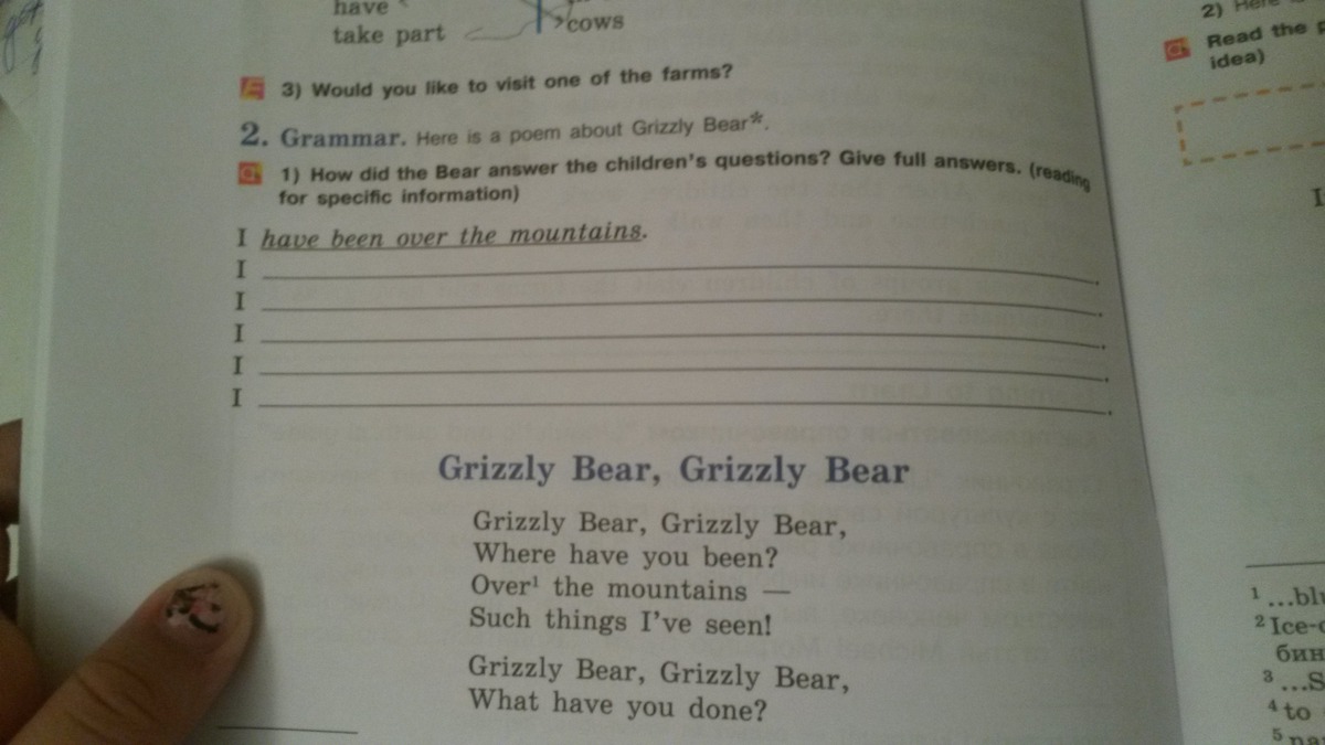 Надо прочитать стихотворение и записать ответы гризли на вопросы детей. В качестве примера приведён ответ на первый вопрос: "Где ты был?" - "Я был в горах".