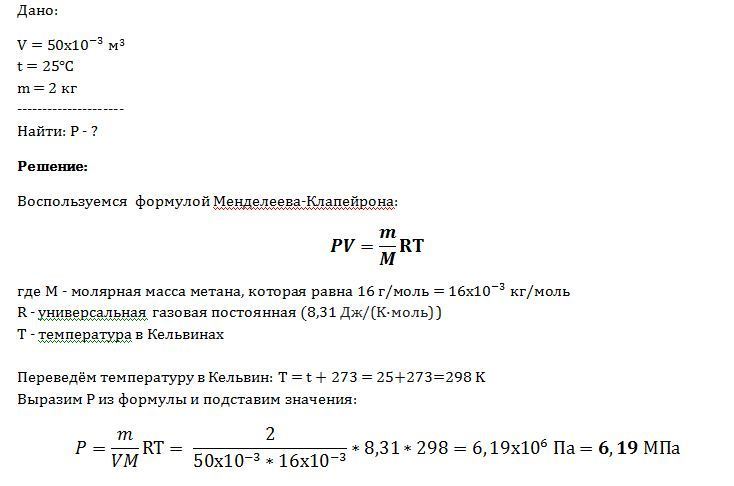 Пожалуйста помогите решить!!!Какое давление должен выдерживать газовый баллон объёмом 50 л,чтобы при температуре 25*С в нём можно было хранить 2 кг метана(CH4)?