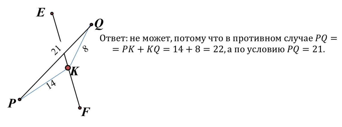 1.Отрезки PQ и EF пересекаются, точка К лежит на отрезке EF, причем PQ= 21 см, PK= 14 см, QK= 8 см. Может ли точка К быть точкой пересечения отрезков PQ и EF? Ответ обоснуйте.