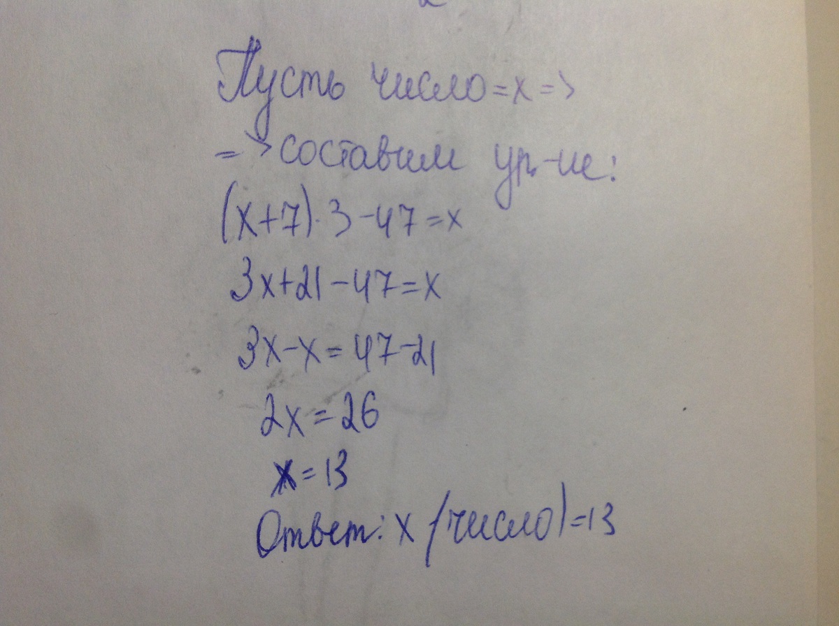 Если к задуманному числу прибавить 7, полученную сумму умножить на 3 и из произведения вычесть 47, то получим задуманное число. Какое задуманное число?