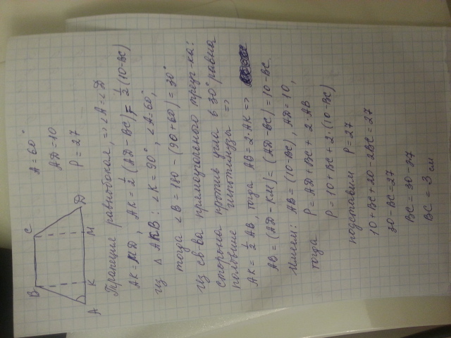 Дана трапеция АBCD. AB=CD(боковые стороны). Угол А=60°. AD=10см. P=27cм.