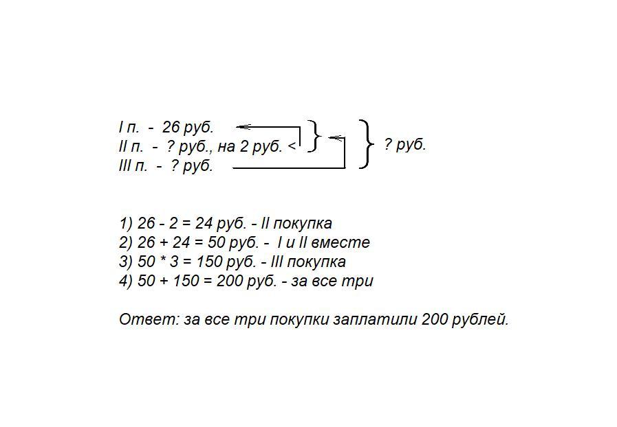 ПЕРВАЯ ПОКУПКА СТОИЛА 26 РУБ, ВТОРАЯ НА 2 РУБ МЕНЬШЕ,ЧЕМ ПЕРВАЯ, А ТРЕТЬЯ В 3 РАЗА БОЛЬШЕ ЧЕМ ПЕРВЫЕ ДВЕ ПОКУПКИ ВМЕСТЕ. СКОЛЬКО РУБЛЕЙ ЗАПЛАТИЛИ ЗА ЭТИ ТРИ ПОКУПКИ? без иксов