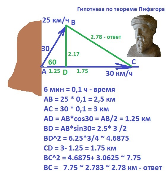 На озері від пристані одночасно відпливають 2 катери.Один з них рухається зі шв 25км/год під кутом 30 до берега,а інший - зі шв 30км/год перпендикулярно до берега.Якою буде відстань між човнами через 6 хв?Відповідь округлити до сотих км.
