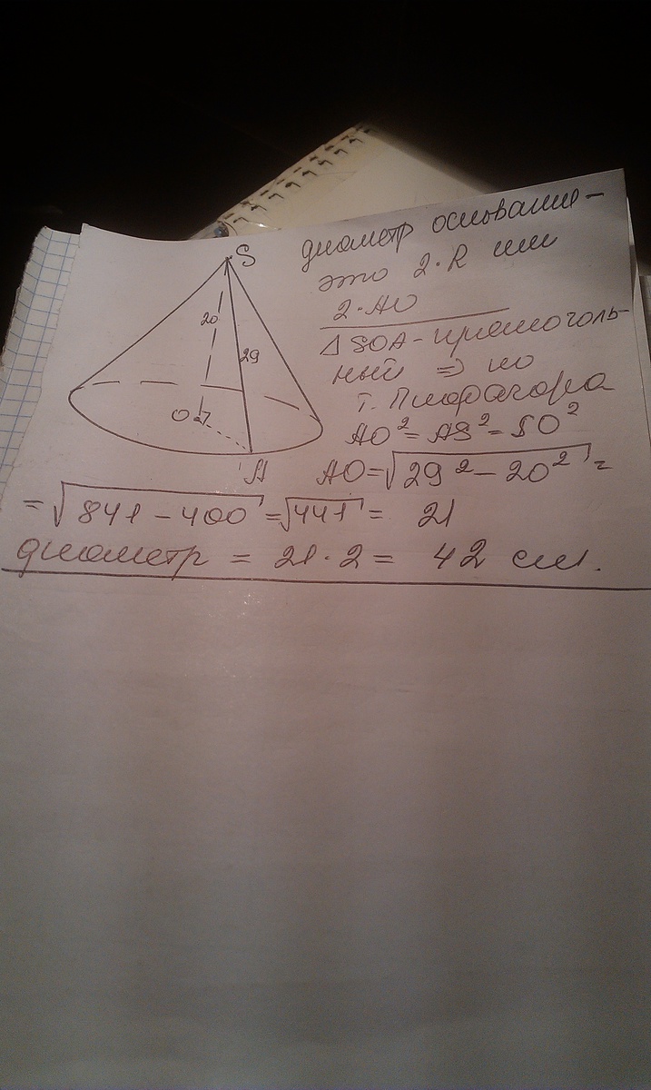 Высота конуса равна 20, а длина образующей равна 29, найдите диаметр основания конуса