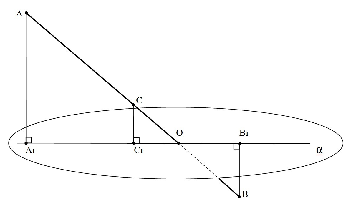 Так как в условии ничего нет про угол, под которым отрезок пересекает плоскость, примем его за 90°. В этом случае действительно можно говорить о том, что расстояния от концов отрезка до плоскости являются частями самого отрезка, то есть перпендикуляры из концов отрезка на плоскость совпадают с самим отрезком.