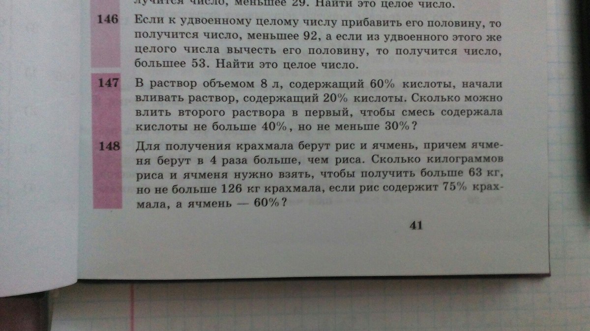В рисе 0,75x кг крахмала содержится в рисе, а 0,6*4x кг крахмала содержится в ячмене. Т. к. нужно сделать так, чтобы крахмала было больше 63 кг, но не больше 126 кг, составляем систему: