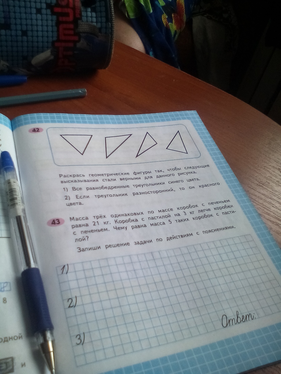расскрась геометрические фигуры так чтобы следущие высказывания стали верными для данного рисунка 1)все равнобедренные треугольники синего цвета 2)если треугольник разносторонний то он красного цвета
