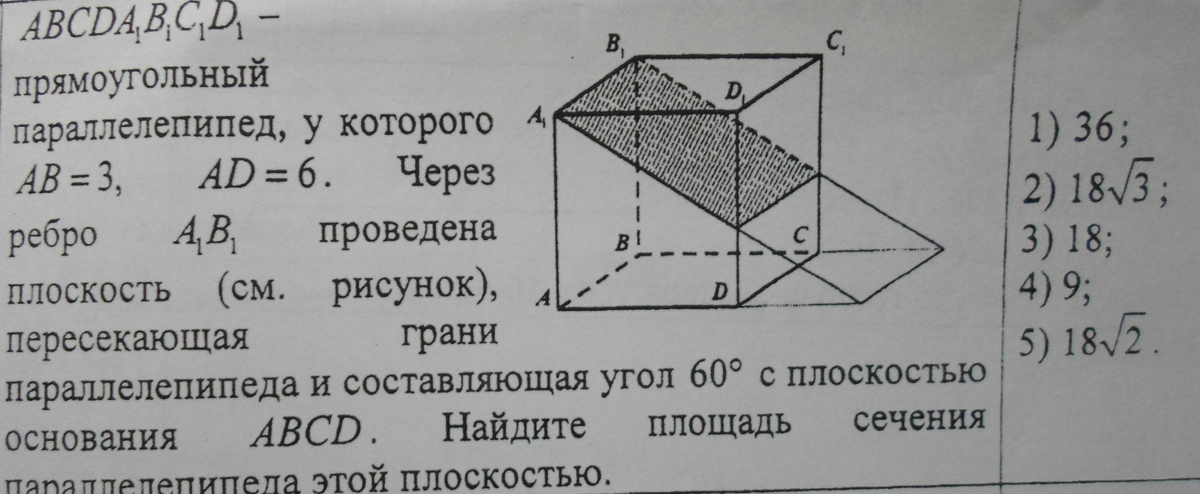 Хэээээлп ,пожалуйстааа "ABCDA1B1C1D1-прямоугольный параллепипед ,у которого AB=3,AD=6.Через ребро А1В1 проведена плоскость пересекающая грани параллепипеда и составляющая угол 60 с плоскостью основания АВСD.Найдите площадь сечения параллелепипеда этой плоскостью