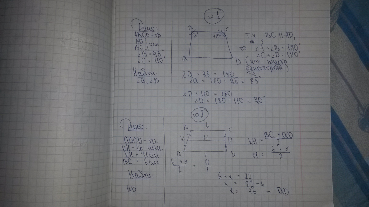 №1 в трапеции АВСD с основаниями AD и ВС, угол В=95 градусов, а угол С=110 градусов. найти остальные углы трапеции №2 средняя линия трапеции равна 11 см. меньшее основание 6 см. найти большее основание №3 диагональ равнобедренной трапеции с основанием 4 см и 10 см является биссектрисой тупого угла трапеции. найти периметр трапеции.
