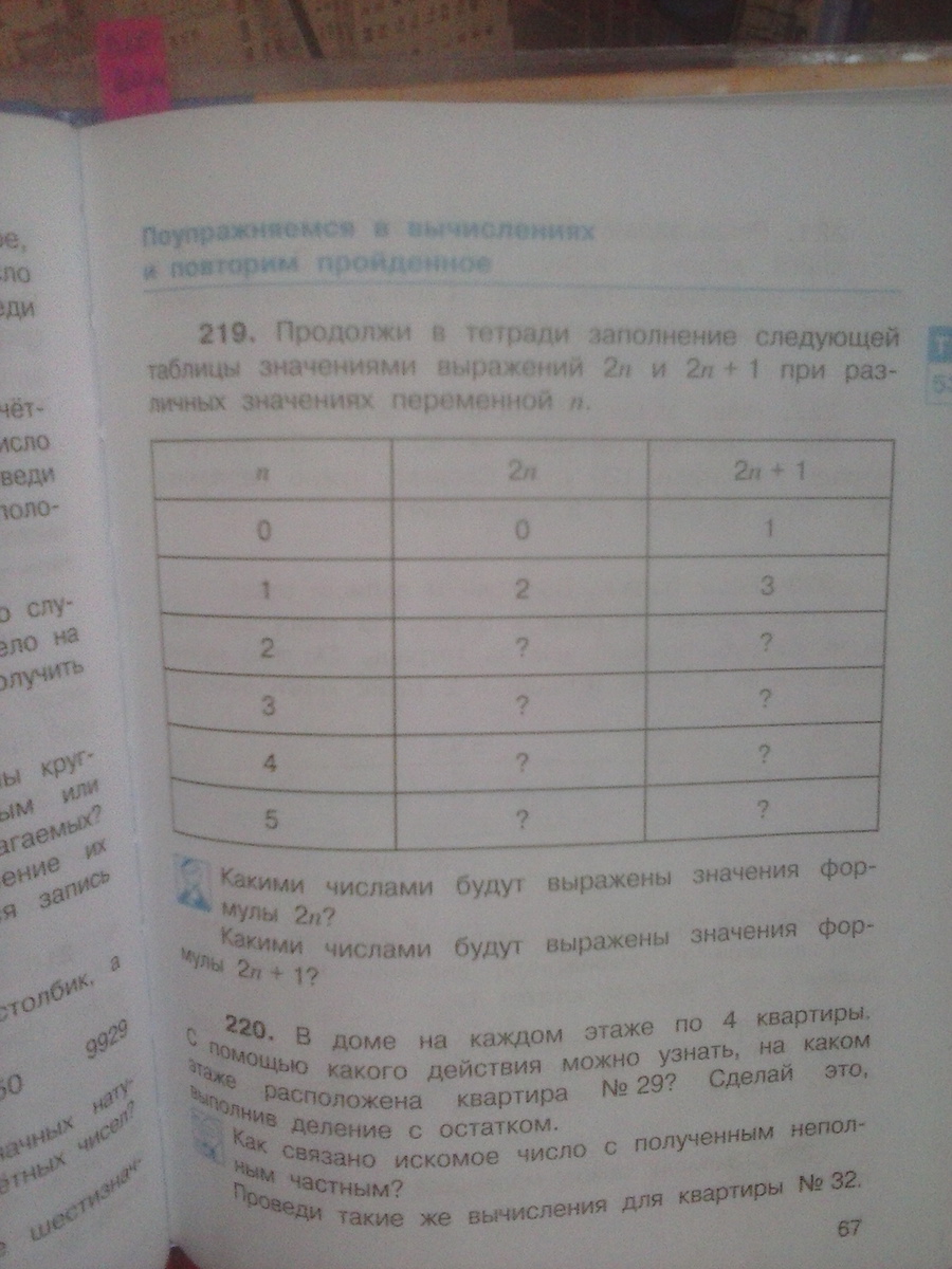 продолжи в тетради заполнение следующей таблицы значениями выражений 2п и 2п +1 при различных значениях переменной п.