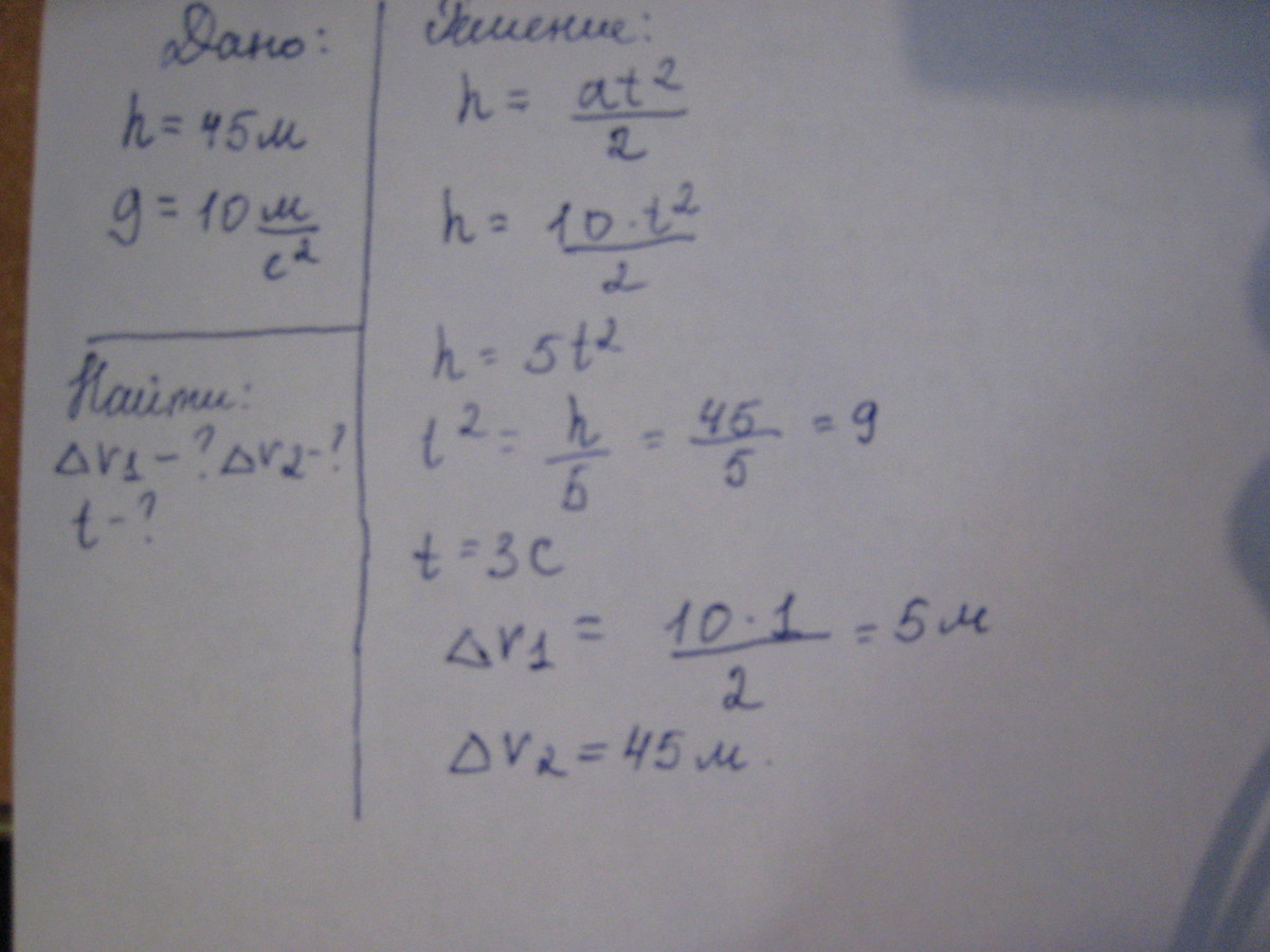 Маленький стальной шарик упал с высоты 45м. Сколько времени длилось его падение? Какое перемещение совершил шарик за первую и последнюю секунды своего движения? (g~10м/с2)