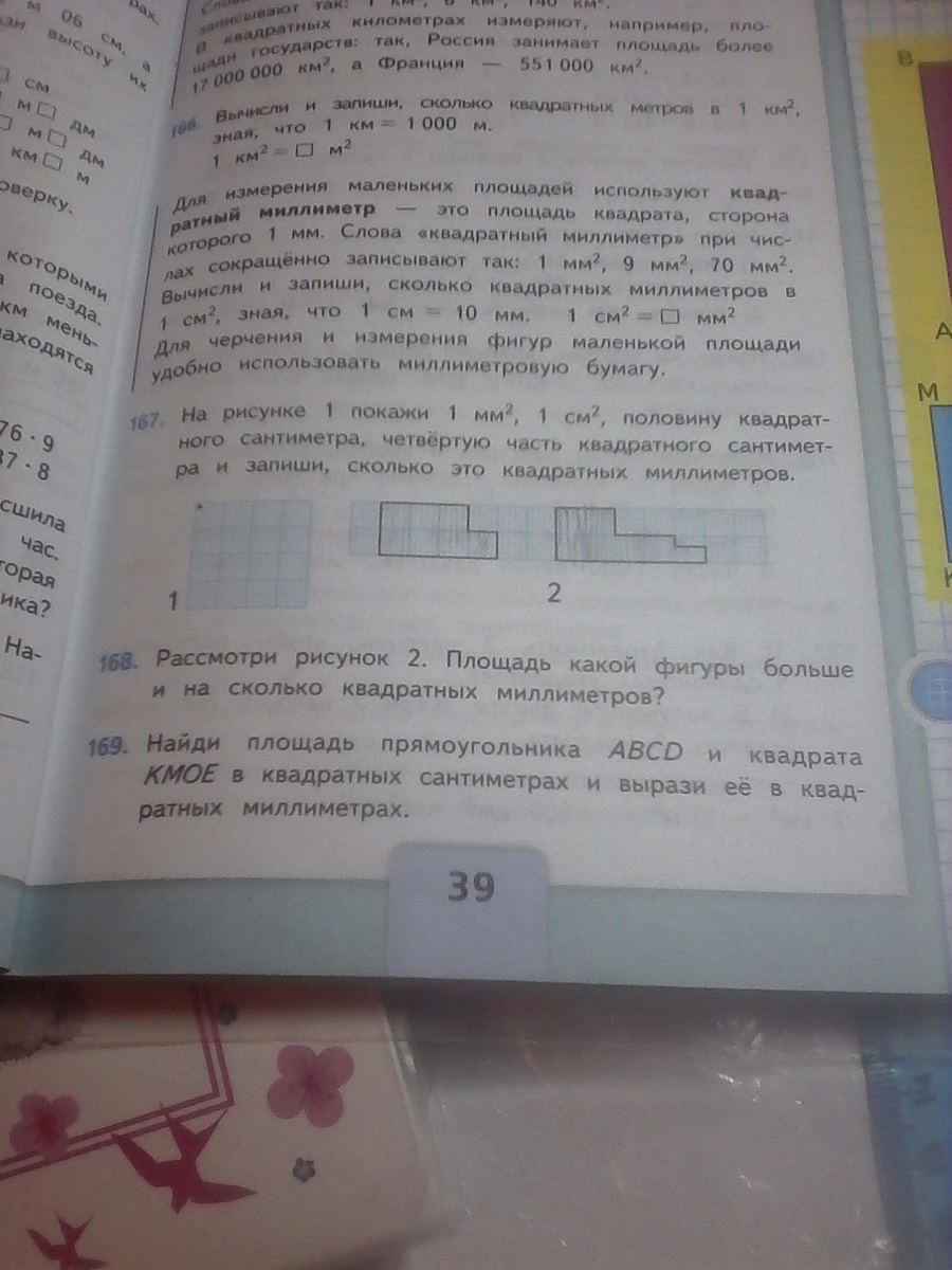 Помогите пожалуйста срочно!!!!! Рассмотри рисунок 2. Прощадь какой фигуры больше и на сколько квадратных миллиметров??? Задание 168
