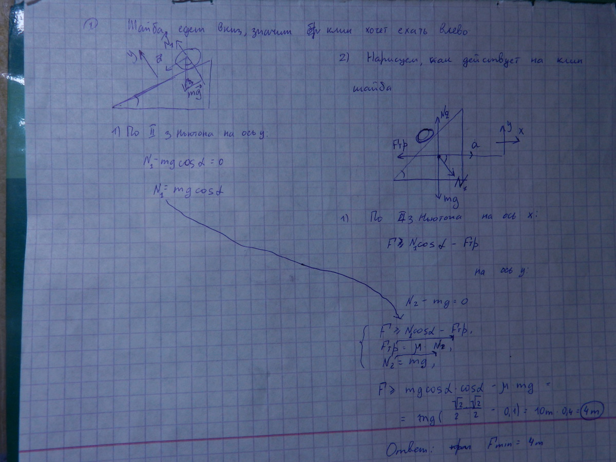 Клин массой m стоит на шероховатой горизонтальной поверх- ности. По гладкой наклонной плоскости клина, образующей угол α = 45 с горизонтом, прямолинейно движется шайба той же массы. Коэффициент трения скольжения клина по горизонтальной поверх- ности равен μ = 0,1. Какую наименьшую по величине горизонтальную силу F следует приложить к клину, чтобы удерживать его неподвижным?