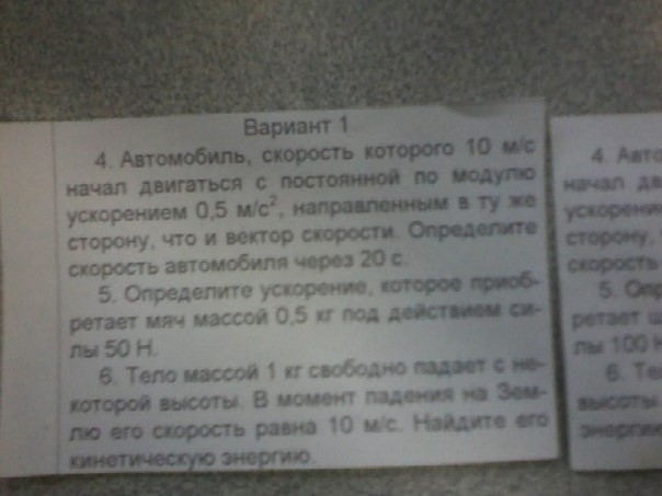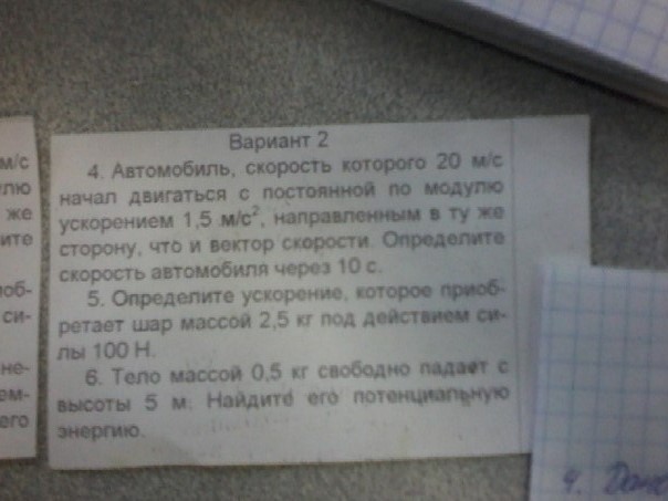 Вар 1. Номер 4. V=V0+at V=10+0,5*20=20м/с Вар 1. Номер 5. a=F/m a=50/0,5=100м/с в кв. Вар 1. Номер 6. Кин.энергия=mv в кв/2 Кин.энергия=1*100/2=50 Вариант 2. Номер 4. V=20+1,5*10=35м/с Вар 2. Номер 5. a=F/m a=100/2,5=40м/с в кв. Вар 2. Номер 6. Потенциальная энергия=gmh Пот.энергия=10*0,5*5=25