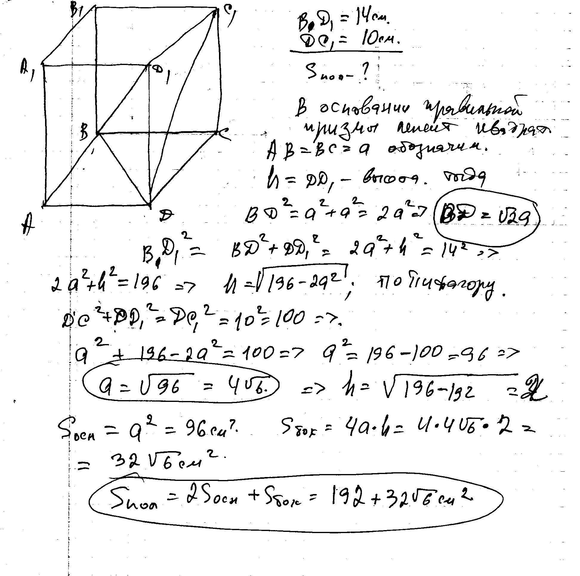 Определить полную поверхность правильной четырёхугольной призмы, если её диагональ равна 14 см, а диагональ боковой грани равна 10 см.