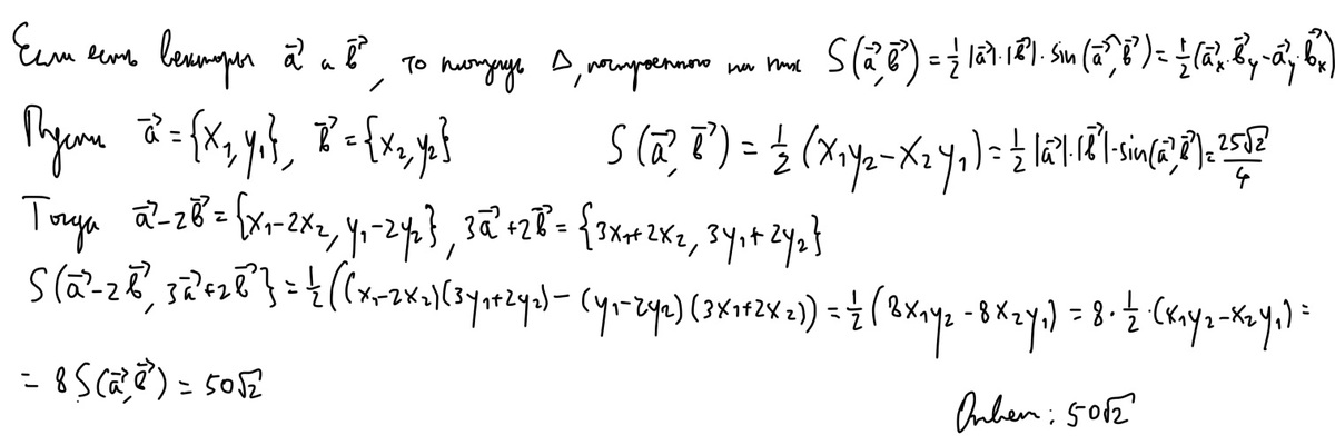 векторы a и b образуют угол 45° . Найдите площадь треугольника , построенного на векторах a -2b и 3a +2b , если |а|=|b| = 5