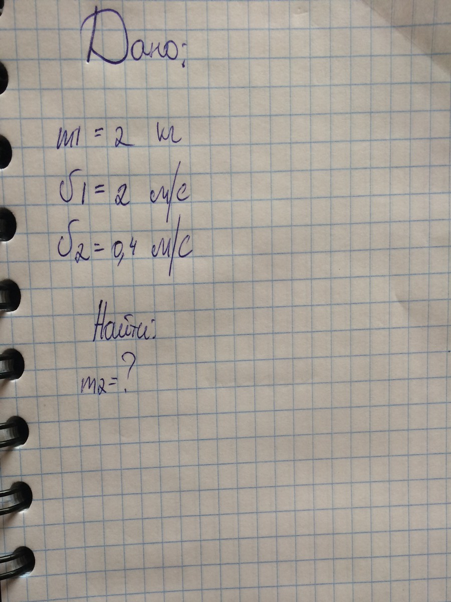 Первая скорость в 5 раз больше скорости второго тела. Я так понимаю, это задача на закон инерции. Во сколько раз скорость одного тела больше скорости другого тела, во столько раз и масса первого тела меньше массы второго тела. Следовательно, масса первого тела в 5 раз меньше второго. Масса второго равна 2*5=10 кг.