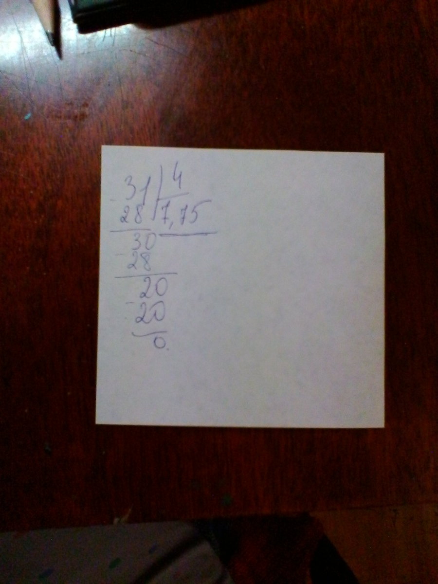 Приписываем ноль и опять делим на 4.Получается опять 7.Остаток 2.И к 2 приписываем ноль и делим на 4.Получается 5.