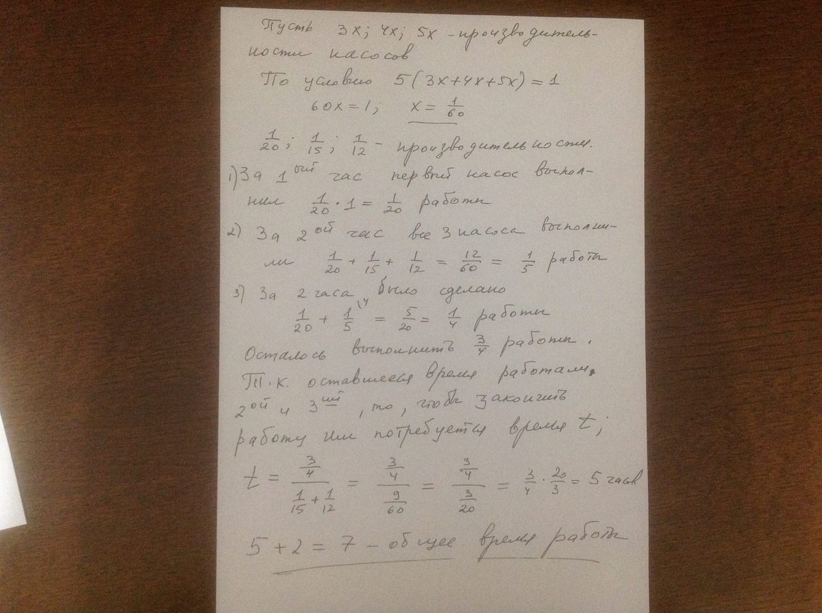 Из трех насосов бассейн наполняется за 5 часов. Производительности насосов относятся как 3:4:5. сколько часов заполнялся бассейн, если сначала работал только первый насос, через час включились второй и третий, а еще через час первый насос сломался.