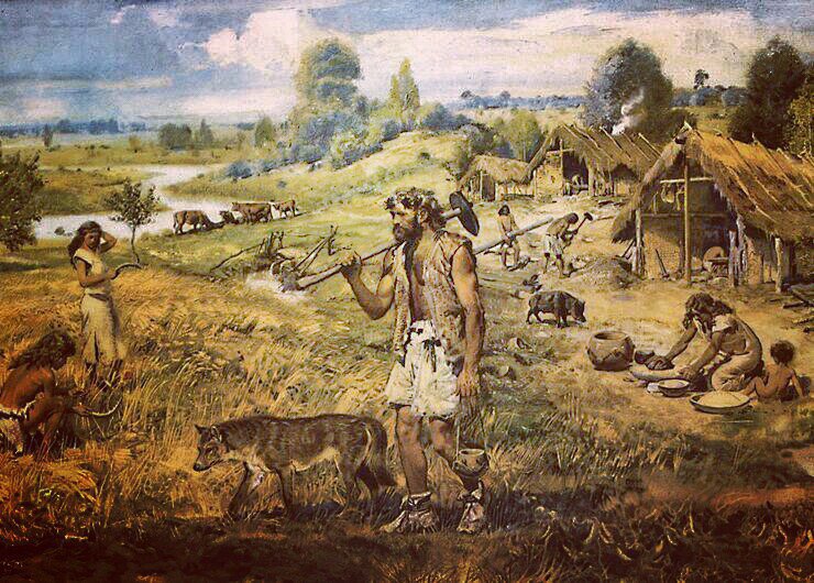 Природа представляет собой цветущую травами равнину, на которой есть река и возможность выпаса скота. Мужчины орудуют молотами и перетаскивают тяжёлые предметы. Явно идёт работа в импровизированных мастерских. Там изготавливается оружие для охоты. Женщины заняты изготовлением пищи и срезанием колосьев пшеницы. Люди живут вместе в ветхих жилищах.