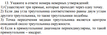 Неправильно третье. Центром описанной около треугольника окружности является точка пересечения перпендикуляров, восставленных из середин сторон треугольника.