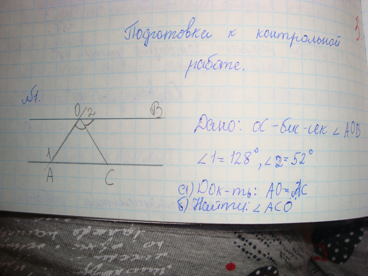Мы получили, что угол1=углуАОВ=128 градусов => прямые ОВ и АС параллельны (т.к. равны накрест лежащие углы)