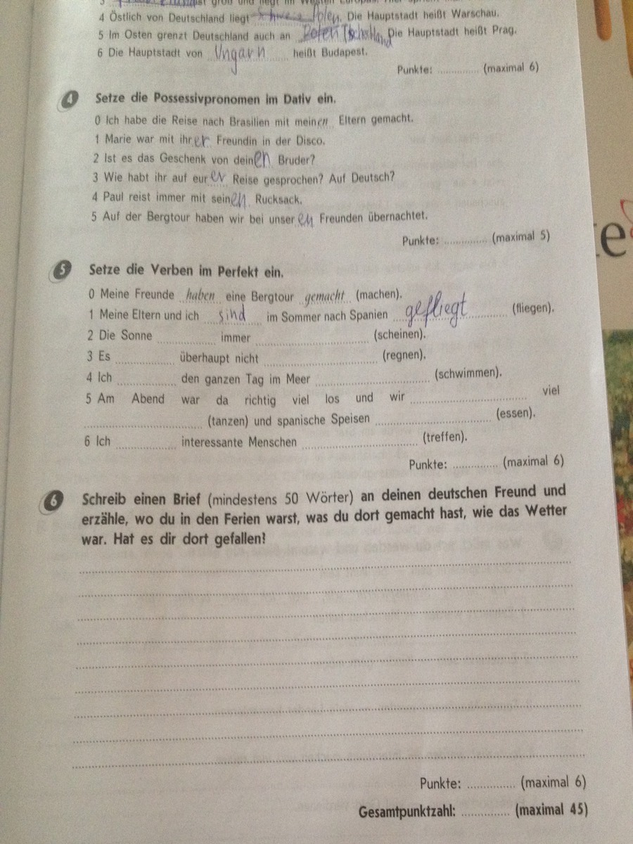 Hallo liebe Marina. Wie geht es dir. Ich habe letzte Woche Ferien gehabt und habe meine Kusine besucht. Sie wohnt in Deutschland in Binz. Das liegt direkt an der Ostsee. Ich habe mit dem Wetter Glück gehabt. Es hat erstaunlicherweise die ganze Zeit die Sonne geschienen und war sehr warm. Wir sind sogar jeden Tag zum Strand gegangen und geschwommen. Es hat uns sehr viel Spaß gemacht. Ich hoffe, dass du nächstes Mal mit mir meine Kusine besuchen darfst.