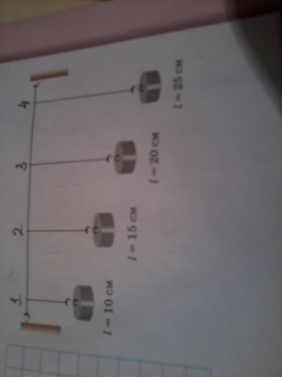 Маятники прикреплены к тонкой горизонтальной нити, как показано на рисунке. Какой из маятников будет иметь наибольшую амплитуду колебаний, если нить раскачивать в горизонтальном направлении с частотой 1 Гц?