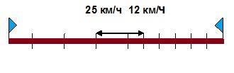 На чертеже показано движение мотоциклиста со скоростью 25 км/ч и велосипедиста со скоростью 12 км/ч.