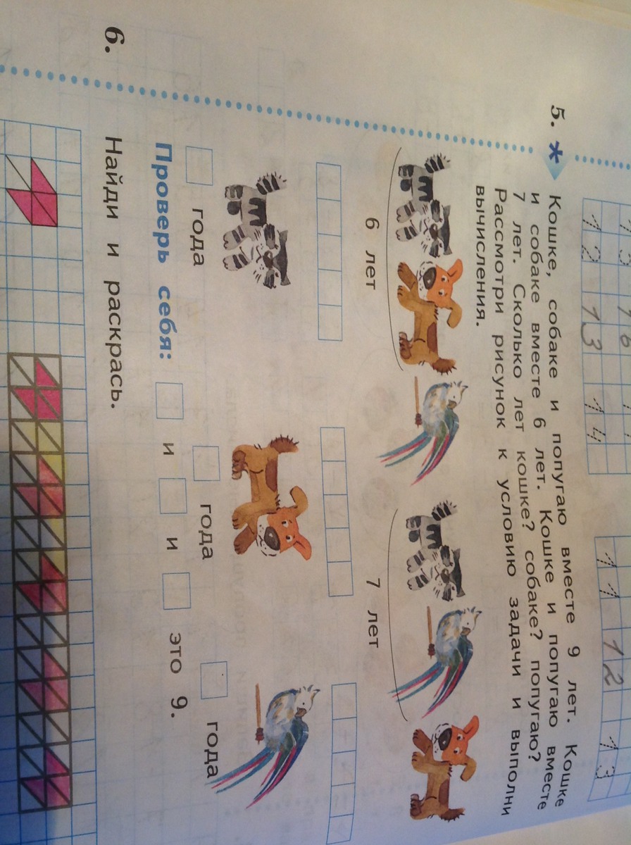 Кошке 2 года, собаке 4, а попугаю 3 то есть