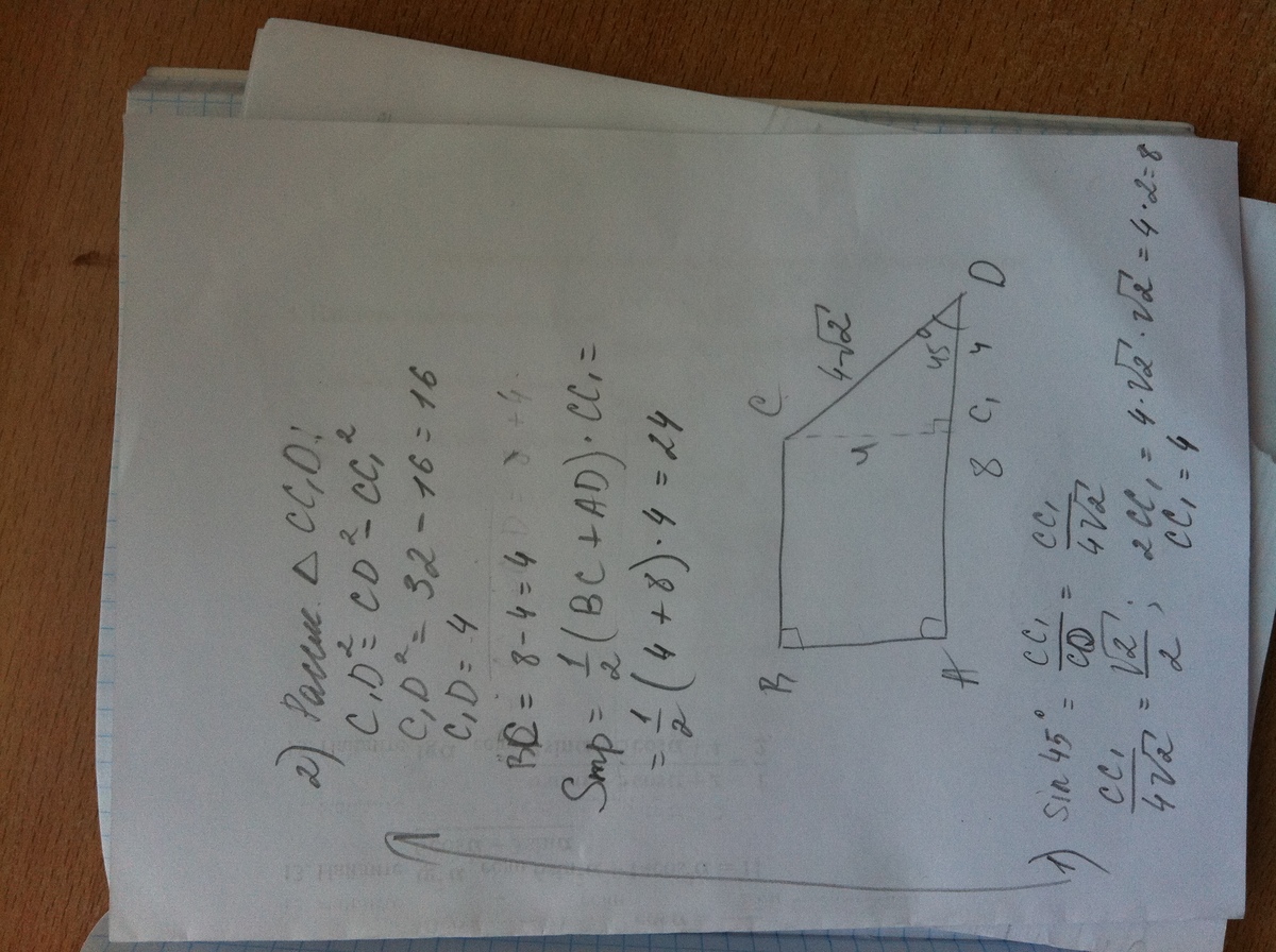 Острый угол А прямоугольной трапеции АВСD равен 45 градусам. Большое основание трапеции равно 8 см, а большая боковая сторона равна 4 корень из 2. Найдите площадь трапеции.