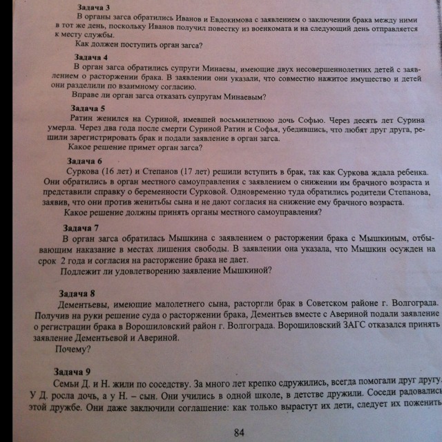 задача6: оргоны месного самоуправления должны решить в пользу молодых. днвушка беременна, а это весомый аргумент. и не важно что там родители говорят, если он сам на это согласен, то разрешать снижение.