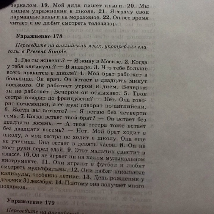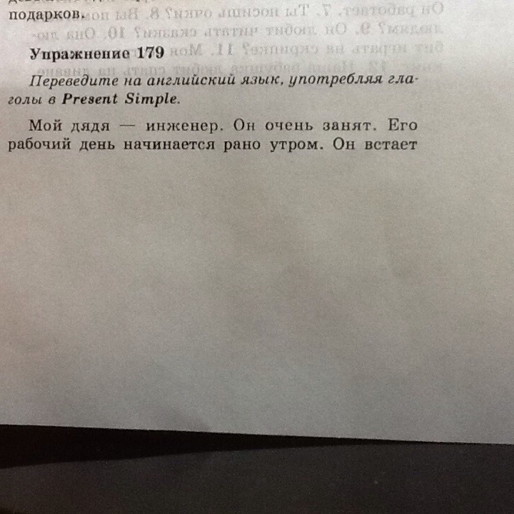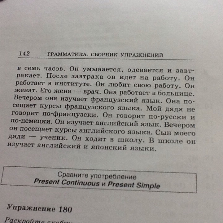 My uncle is an engineer. He is very busy. His working day begins early in the morning. He gets up at seven o'clock. He washes, dresses and has breakfast. After breakfast he goes to work. He works at an institute. He likes his work. He is married. His wife is a doctor. She works at a hospital. In the evening she studies French. She attends French classes. My uncle does not speak French. He speaks Russian and German. He studies English. In the evening he attends English classes. My uncle's son is a pupil. He goes to school. At school he studies English and Japanese.