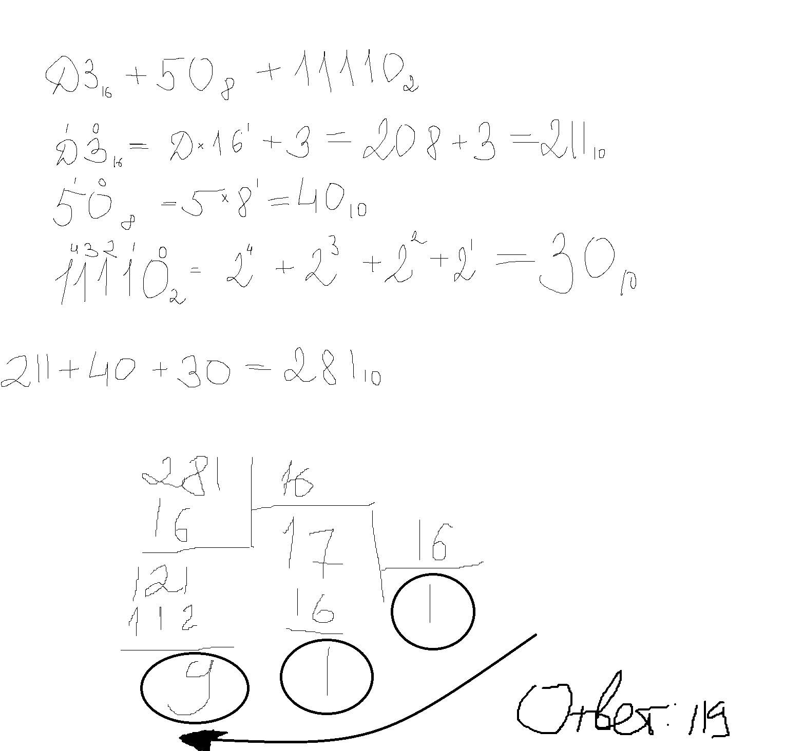 Найдите значение выражения . Ответ дайте в шестнадцатеричной системе счисления : D3(маленькие цифры внизу 16) + 50(маленькими цифрами 8) +11110(маленькими цифрами внизу 2)