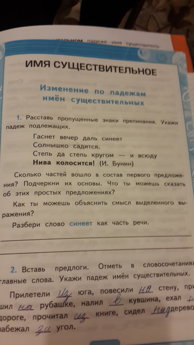 2)В состав предложения вошло 3 части :гаснет(гл.) вечер(сущ),даль(сущ) синеет(гл.), солнышко(сущ) садится(гл.). Эти предложения являются однородными членами.