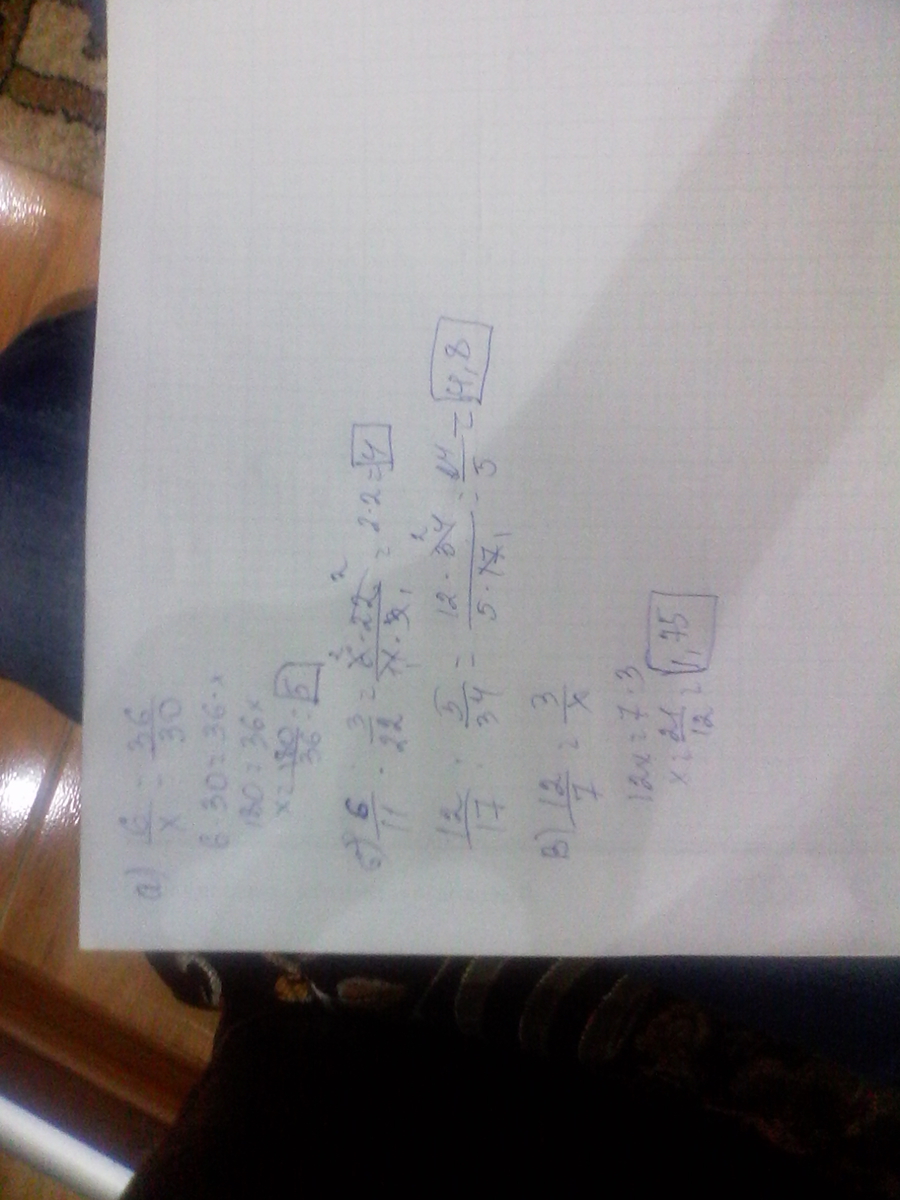Решите уравнения используя основное свойство пропорции а)6:х=36:30 б)6/11:3/22 и 12/17:5/34 в)12:7=3:х