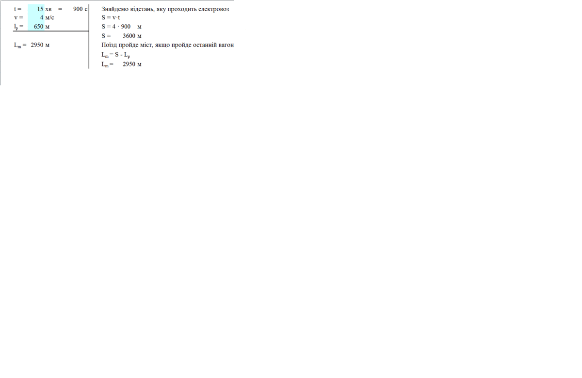 Потяг завдовжки 650м рухаэться рівномірно зі швидкість 4м/с по мосту і проходить його за 15 хв. Визначте довжину моста.
