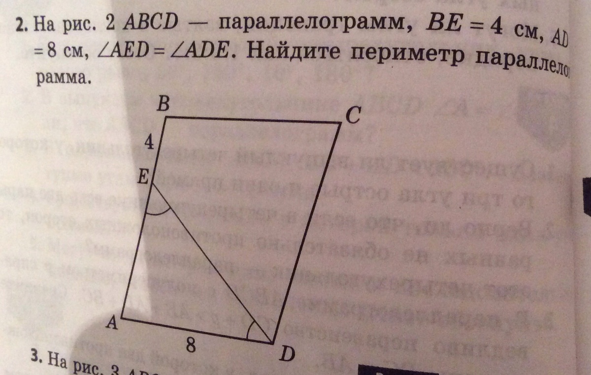 Т.к.AB= АЕ+ЕВ= 8+4=12;AD=8,то отсюда следует, что Р параллелограмм ABCD= (8+12)×2=40(т.к. противоположные стороны параллелограмма равны)