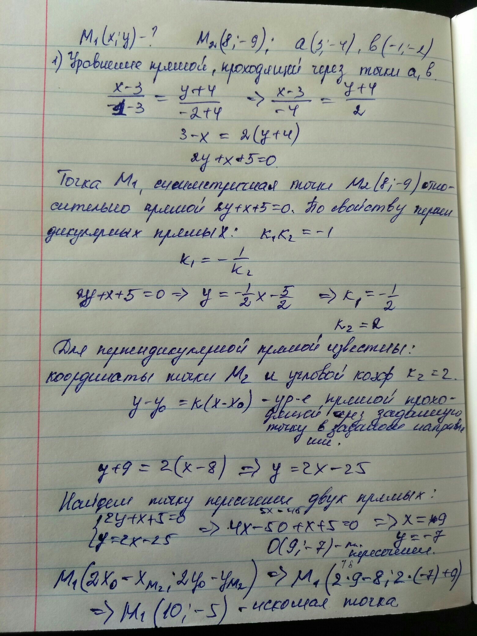 найти точку м1 симметричную точке м2(8;-9) относительно прямой проходящей через точки а(3;-4) и б(-1;-2)