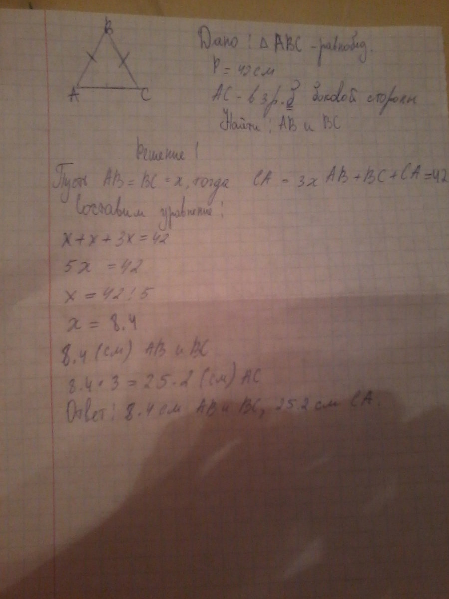В равнобедренном треугольнике боковая сторона в 3 раза больше основания а его периметр равен 42 см