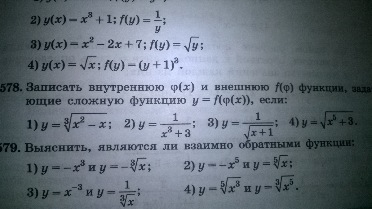 я чтобы понять это задание нашла пример в интернете, как находят внутр и внеш для у=sin(3х-5), там поясняют так: сначала мы подставим х в выражение 3х-5 и подсчитаем, значит многочлен 3х-5 это внутренняя я функция, потом мы вычислим sin от полученного значения-значит синус будет внешней функцией