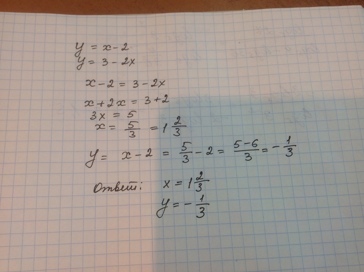 Найдите координаты точки пересечения графиков линейных функций: y=x-2 и y=3-2x