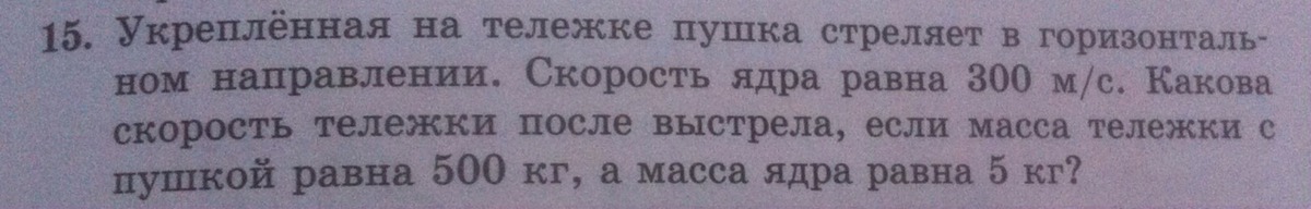 укрепленная на тележке пушка стреляет в горизонтальном направлении. скорость ядра равна 300 м/с. какова скорость тележки после выстрела, если масса тележки с пушкой равна 500 кг, а масса ядра равна 5 кг?